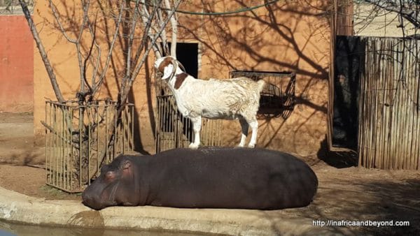 We thought it was unusual that the goat and the hippo were in the same enclosure. We were amazed when we saw the goat jump onto the hippo’s back and the hippo seemed just fine with it.