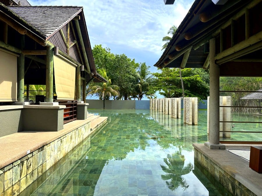 We stayed in the suites which were set in clusters around central swimming pools. Our room consisted of a king size bed, a sitting area, a work area, a Nespresso machine and a minibar. Coco de Mer shaped chocolates, welcome gifts and a pillow menu awaited us, and sliding doors led to a patio with garden views. The bathroom had a bathtub, a shower, double vanity basins and wardrobes.