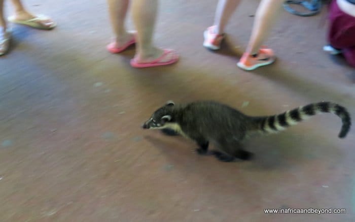 Iguazu National Park is teeming with animal and bird life. As we walked through the verdant rainforest, we saw the ubiquitous coatis, members of the raccoon family, everywhere. They would run in between the people sniffing for food too. However, visitors are warned not to feed them as this can cause them to become aggressive.