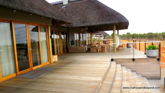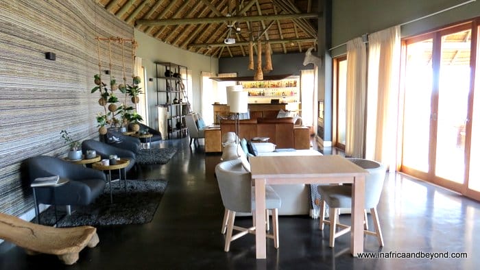 The main lodge building is an expansive open-plan dining and seating area. On the wooden deck outside, is an outdoor lounge overlooking a waterhole set in an open plain, as well as the heated swimming pool which attracts the elephants. There is constant wildlife activity here and the views are amazing. I was told that there had been 3 cheetah kills in front of the lodge in the past year!