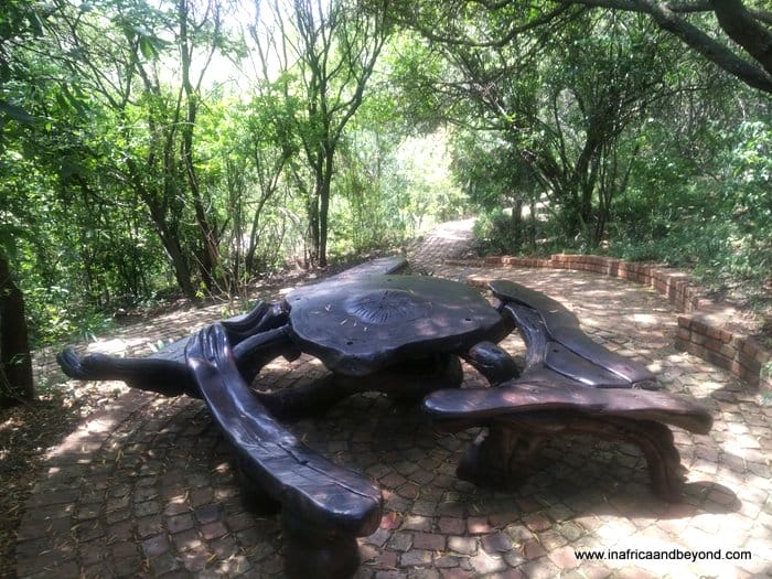 The landscaped lawns are divided into different sections and creatively sculptured benches dot the grounds.   There are several walking and hiking trails winding through the gardens. The longest one is 3.5 km. Starting next to the waterfall, it will take you to the summit of the waterfall and  around the reserve. Be warned though, it involves some steep ascents.